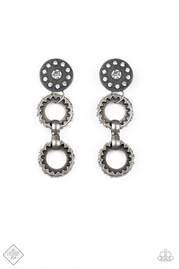 Featuring a gritty tin finish, a pair of white rhinestone encrusted rings link to the bottom of a studded antiqued silver frame radiating with dainty white rhinestones. The edgy lure swings from the ear, creating an industrial design. Earring attaches to a standard post fitting.