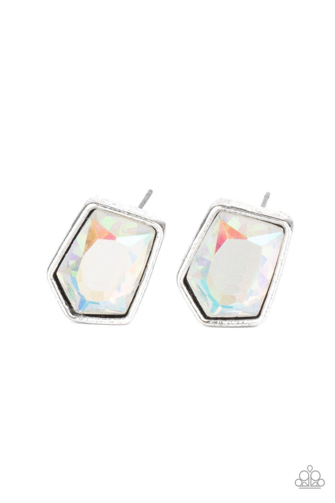 Featuring a raw asymmetrical cut, an iridescent gem is encased inside a sleek silver frame, creating a stellar display. Earring attaches to a standard post fitting.