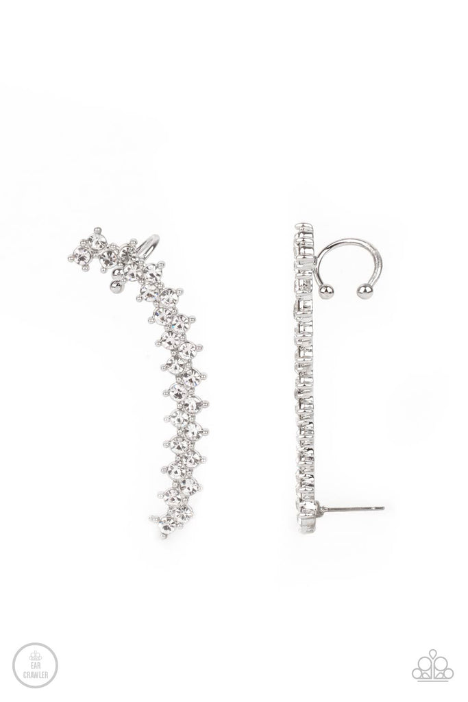 Encased in studded silver fittings, pairs of glassy white rhinestones stack into a zigzagging frame up the ear for an electrifying fashion. Features a dainty cuff attached to the top for a secure fit.