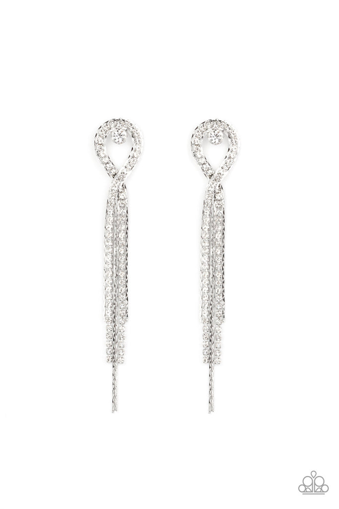 A lasso of glassy white rhinestones nestles around a solitaire white rhinestone, while a tassel of flat silver chains stream out from the bottom for a glamorous finish. Earring attaches to a standard post fitting.