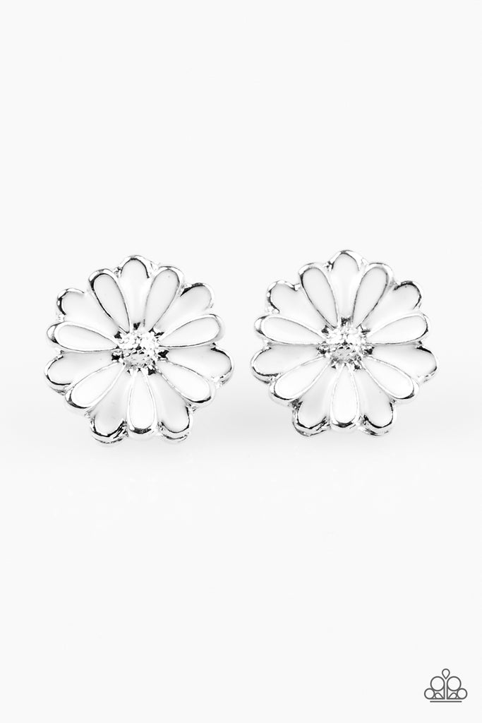 Brushed in a shiny white finish, dainty petals gather around a textured silver center for a whimsical look. Earring attaches to a standard post fitting.