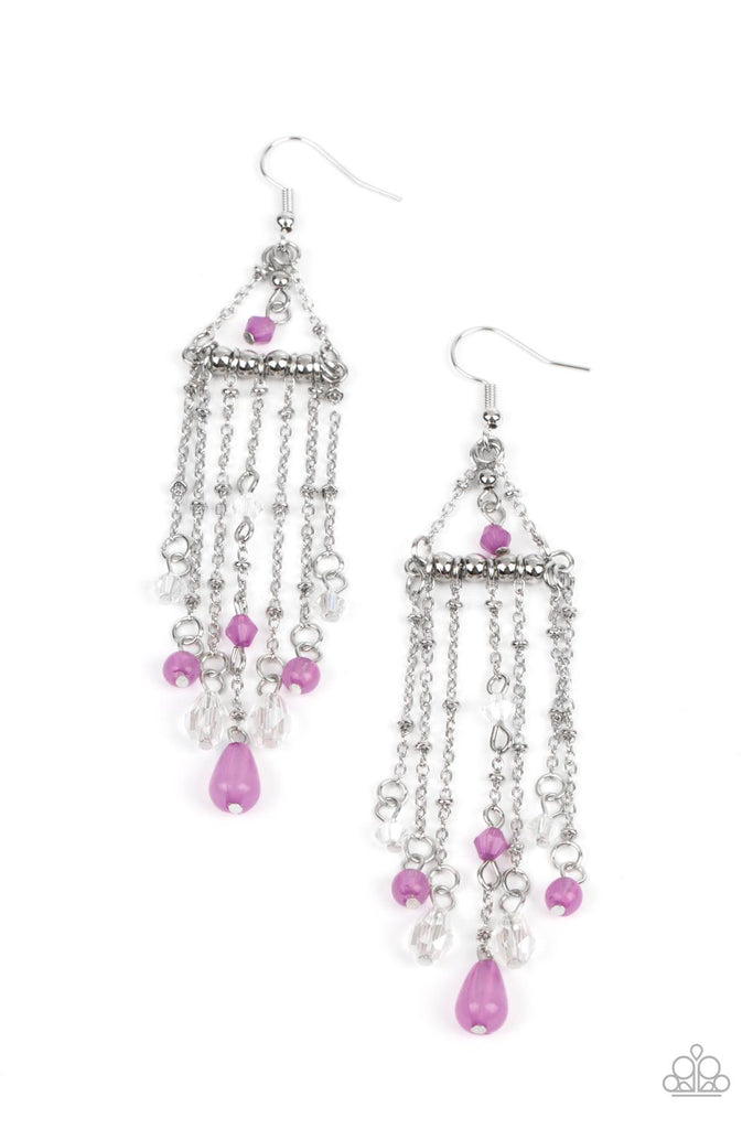 Tassels of silver chains fall from the bottom of a silver bar suspended by a pair of satellite chains. A faceted Lavender bead swings from the top of the frame, with additional Lavender accents and clear crystal beads adding playful pops of color to the tassels below. Earring attaches to a standard fishhook fitting.