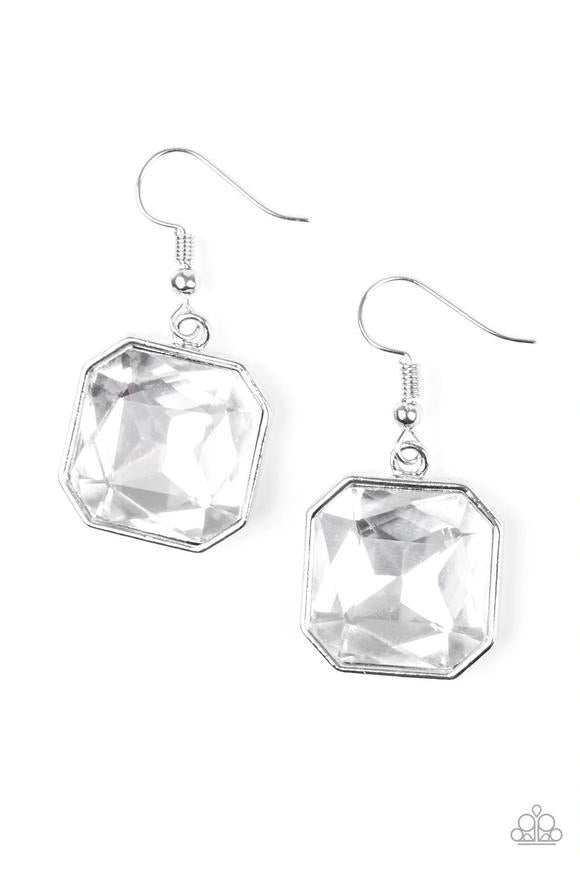 A faceted white gem is pressed into a glistening silver frame for a dramatic look. Earring attaches to a standard fishhook fitting.