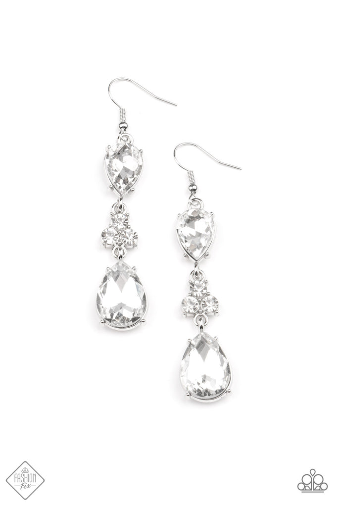 A trio of dazzling white rhinestones unites two white teardrop gems as they dangle brilliantly from the ear for a flawless finish. Earring attaches to a standard fishhook fitting.
