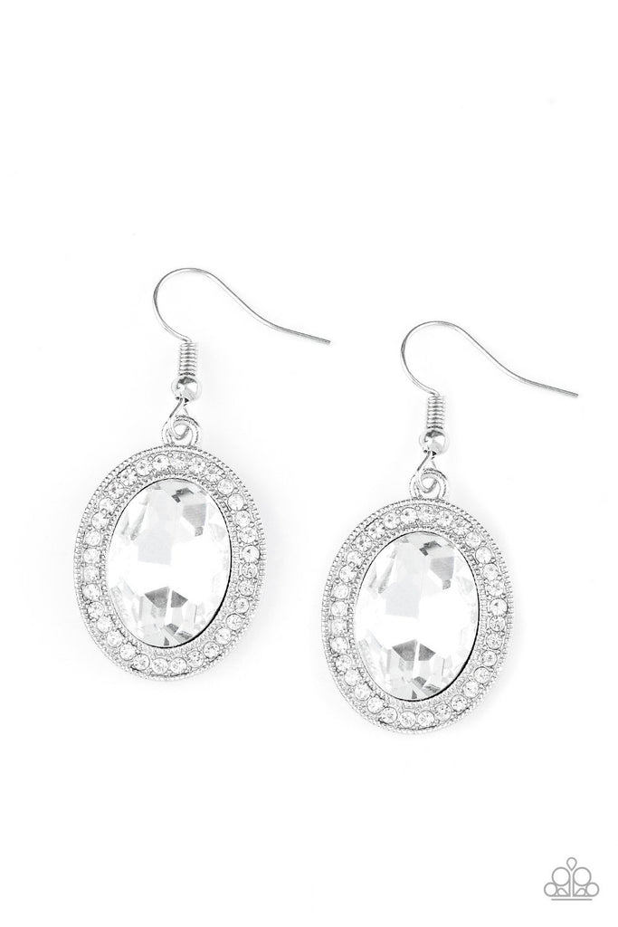 An oversized white gem is pressed into the center of a silver frame radiating with glassy white rhinestones for a glamorous look. Earring attaches to a standard fishhook fitting.