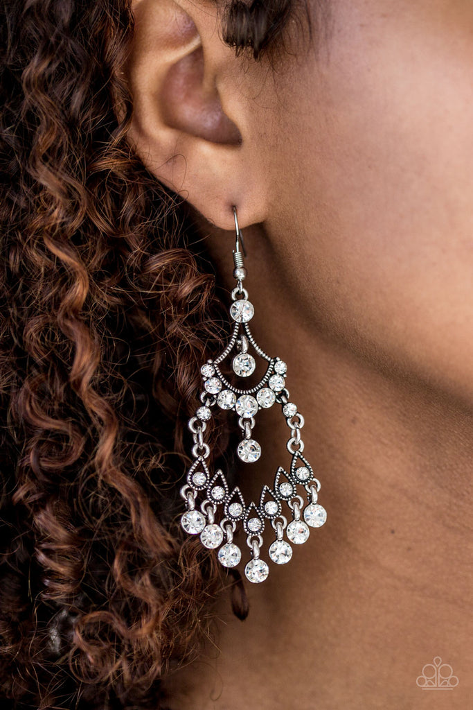 Glittery white rhinestones are sprinkled along stacked silver frames, creating an elegant lure. Matching white rhinestones swing from the bottom of the elaborate lure, adding a glamourous finish to the regal palette. Earring attaches to a standard fishhook fitting.