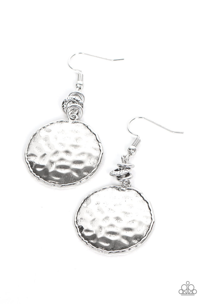 A dainty collection of smooth and hammered silver rings gives way to an antiqued silver disc. Bordered in an asymmetrical silver trim, the hammered disc ripples in the light with each turn and twist. Earring attaches to a standard fishhook fitting.