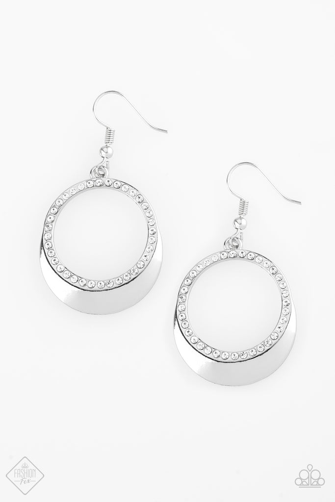 Featuring a beveled edge, a glistening silver frame in encrusted in a ring of glittery white rhinestones for a refined look. Earring attaches to a standard fishhook fitting.