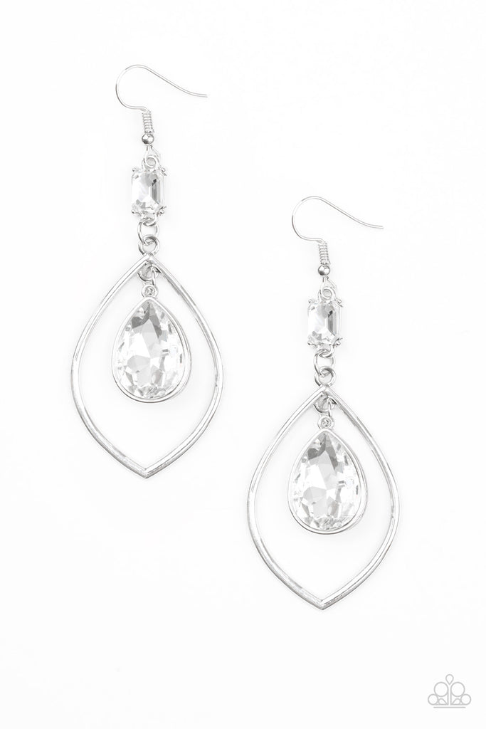 Infused with a white gem fitting, a dramatic white teardrop gem swings from a glistening silver teardrop silhouette for a glamorous look. Earring attaches to a standard fishhook fitting.