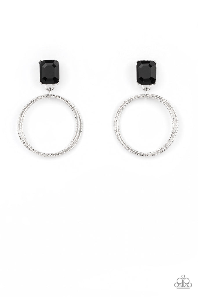Encased in a pronged silver setting, a black emerald cut rhinestone links with a trio of textured silver rings, creating a romantic lure. Earring attaches to a standard post fitting.