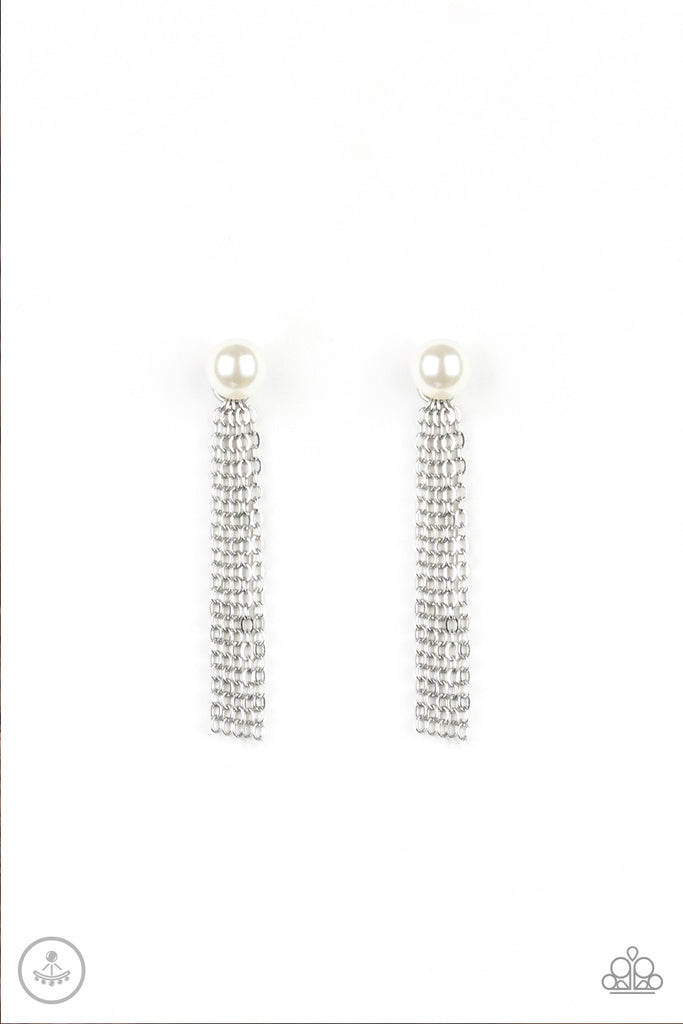 A solitaire white pearl attaches to a double-sided post, designed to fasten behind the ear. Brushed in a high-sheen shimmer, glistening silver chains peek out beneath the ear for a bold tasseled look. Earring attaches to a standard post fitting.