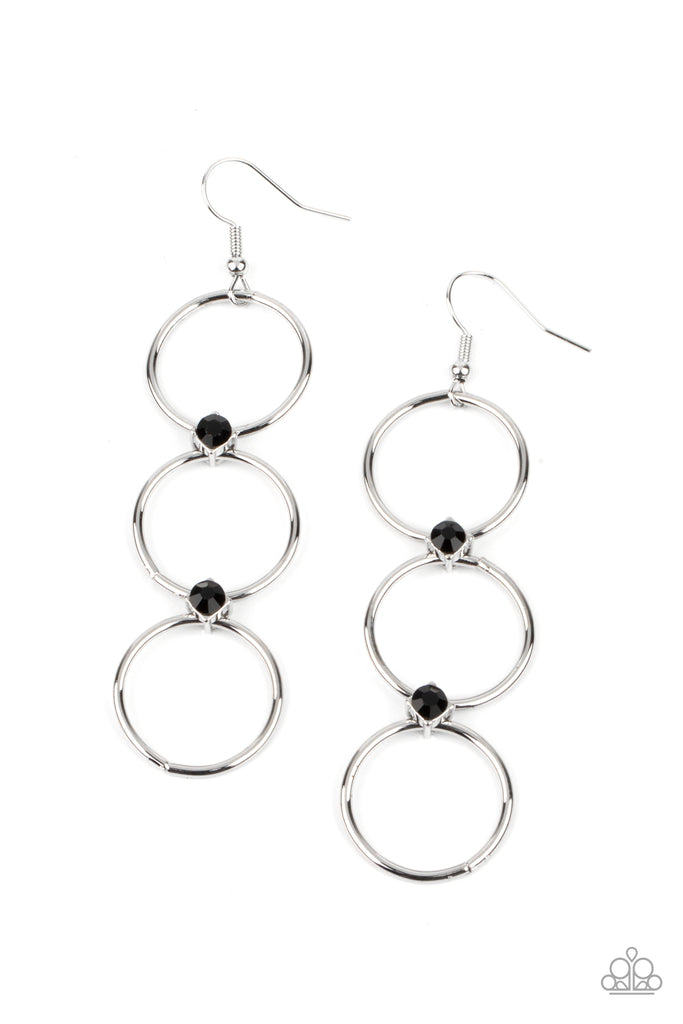 Three silver hoops, joined together by small jet black rhinestone accents, dangle from the ear for a classically refined finish. Earring attaches to a standard fishhook fitting.