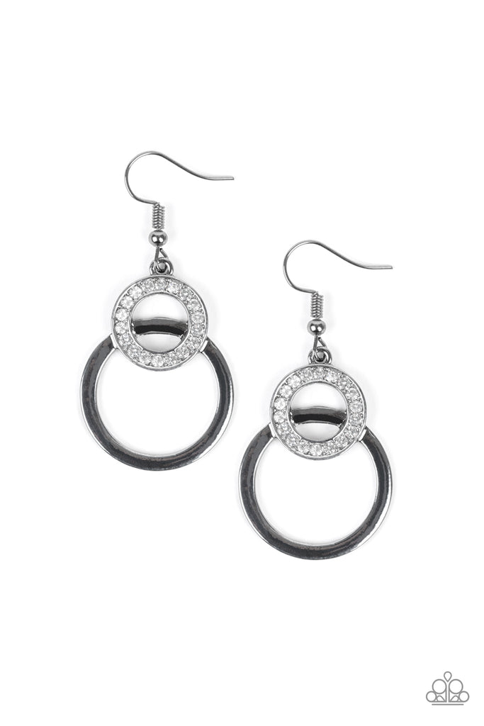 A ring of glittery white rhinestones overlaps with a glistening gunmetal hoop, coalescing into a refined stacked lure. Earring attaches to a standard fishhook fitting.