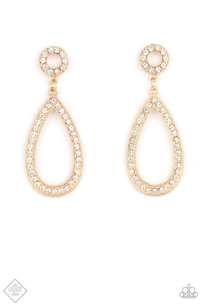 Alluring oversized teardrop frames are encrusted with countless brilliant white rhinestones. A smaller circle frame filled with the same shimmering white rhinestones gently anchors and balances the flirtatious look. Earring attaches to a standard post fitting.