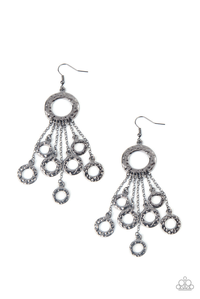 Attached to dainty gunmetal chains, a fringe of hammered gunmetal rings swings from the bottom of a matching hammered ring for a noise-making statement. Earring attaches to a standard fishhook fitting.