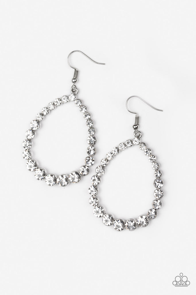 Gradually increasing in size near the center, bubbly white rhinestones encrust a shiny silver teardrop for a glamorous look. Earring attaches to a standard fishhook fitting.