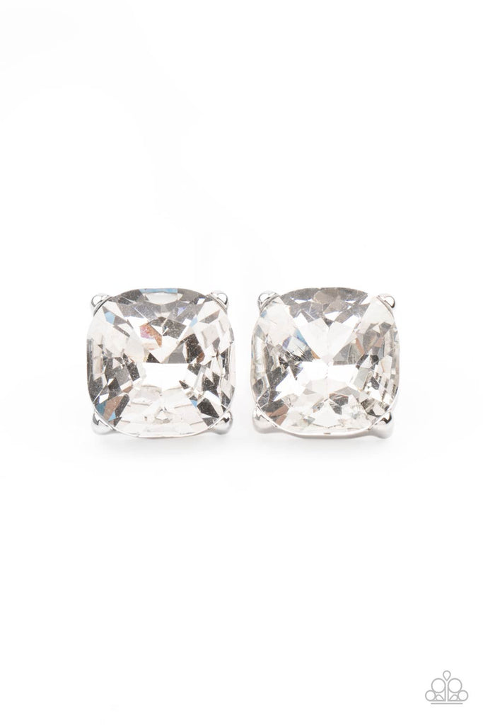 A dramatically oversized white gem is nestled atop a pronged silver frame, creating a jaw-dropping dazzle. Earring attaches to a standard post fitting.