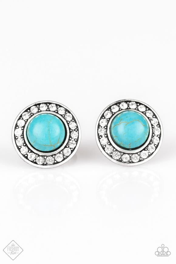 A refreshing turquoise stone is pressed into the center of a round silver frame radiating with glassy white rhinestones, creating an earthy, yet refined design. Earring attaches to a standard post fitting. Sold as one pair of post earrings.