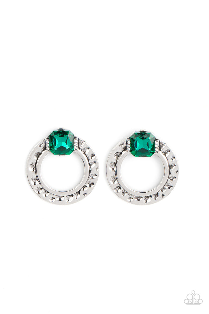 Featuring a radiant cut, a green rhinestone sparkles between two dainty rows of glassy white rhinestones atop a hammered silver ring for a gritty yet glamorous finish. Earring attaches to a standard post fitting.