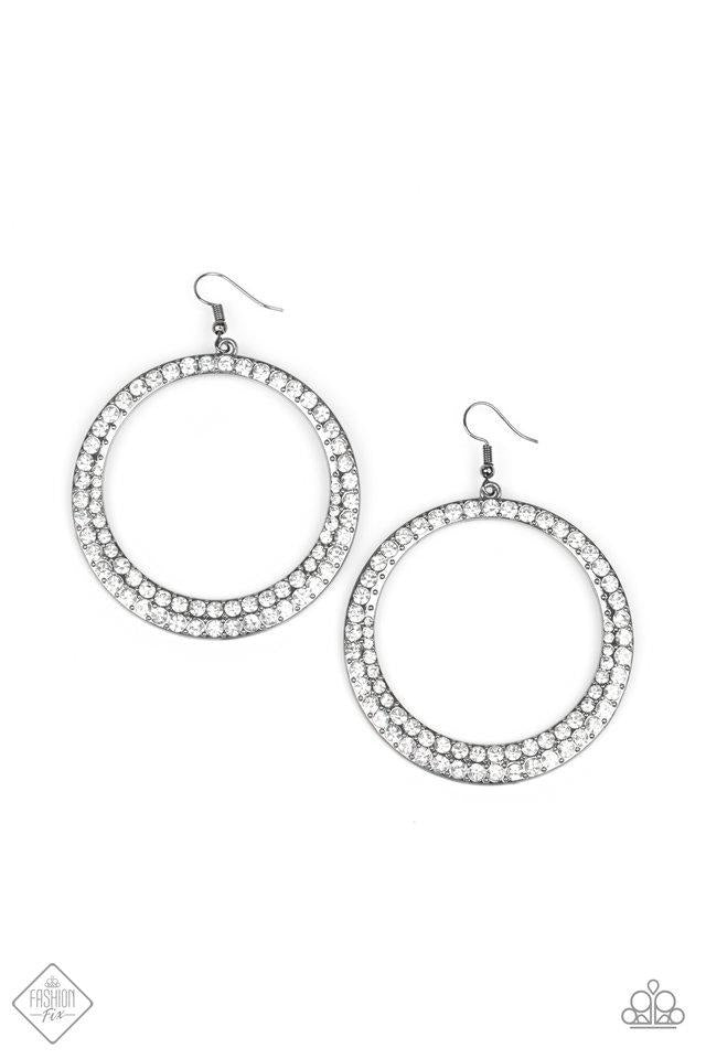 An over-sized gunmetal hoop is encrusted in glittery white rhinestones resulting in a blinding shimmer that refuses to be ignored. Earring attaches to a standard fishhook fitting.