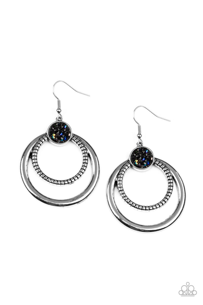 Smooth and textured silver hoops connect to the bottom of a silver fitting embellished in glitzy oil spill and hematite rhinestones, creating a dizzying lure. Earring attaches to a standard fishhook fitting.