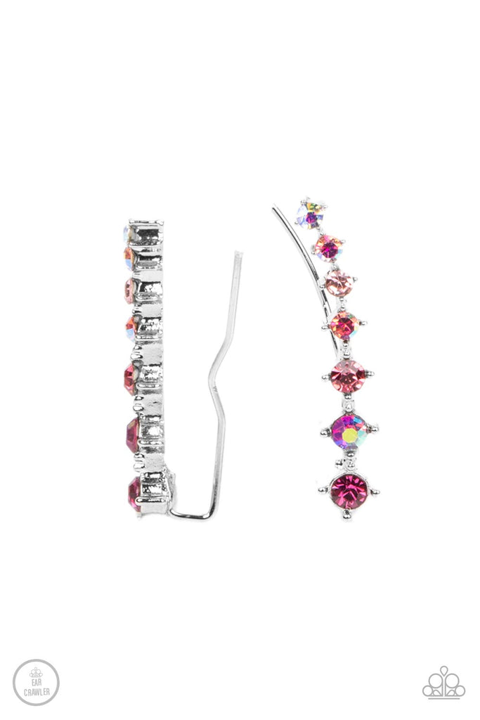 An iridescent spectrum of dainty pink rhinestones gradually increase in intensity as they climb the ear for a stellar fashion. Features an extended post fitting that climbs the back of the ear and can be pressed together for a more secure fit.