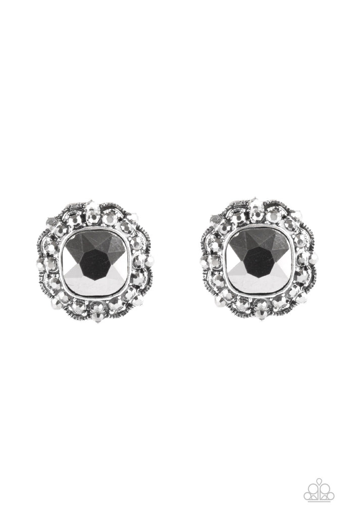 Encrusted in glassy hematite rhinestones, an ornate silver frame spins around a glittery hematite gem center for a regal look. Earring attaches to a standard post fitting.