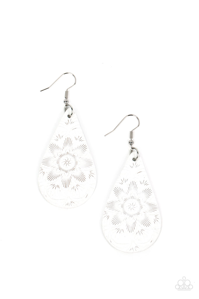 Embossed in a tropical floral pattern, a distressed white leather teardrop swings from the ear for a whimsically rustic flair. Earring attaches to a standard fishhook fitting.