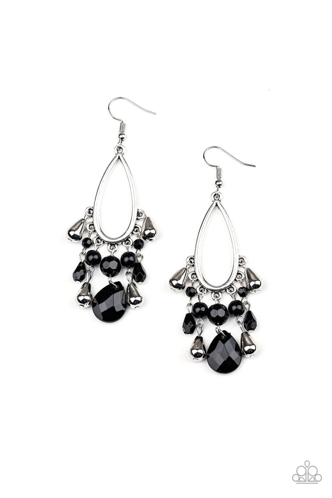 Infused with shiny silver teardrop beads, a glassy collection of faceted black crystal-like beads cascade from the bottom of a shimmery silver teardrop frame for a whimsical flair. Earring attaches to a standard fishhook fitting.