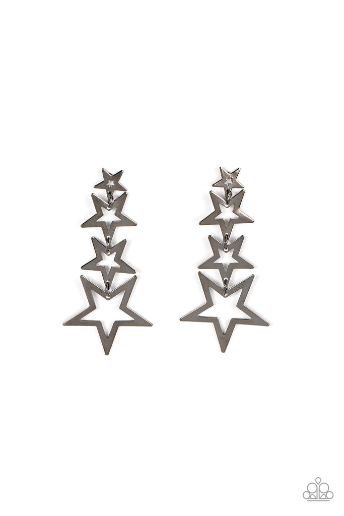 Flat gunmetal star frames gradually increase in size as they delicately link into a stellar tassel, resulting in an out-of-this-world fashion. Earring attaches to a standard post fitting.