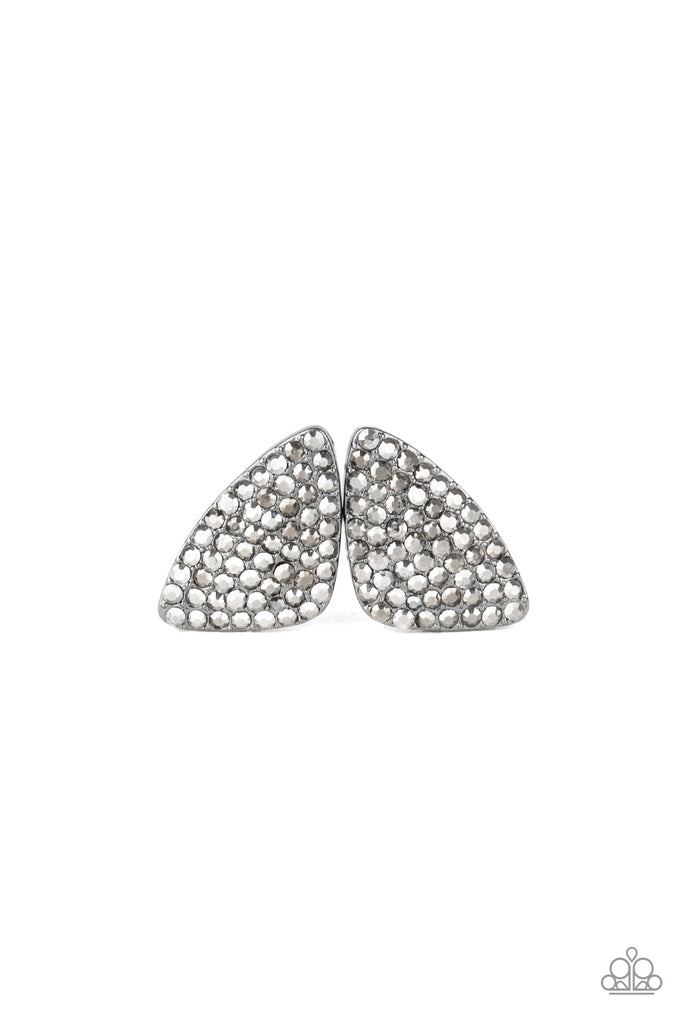 The front of a triangular shaped frame is encrusted in row after row of glittery hematite rhinestones for a blinding look. Earring attaches to a standard post fitting.