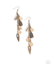 A mix of textured and smooth gold and brass shapes, including teardrops, discs, and bars, dangle from cascading silver chains, creating a layered and dynamic effect. Earring attaches to a standard fishhook fitting.