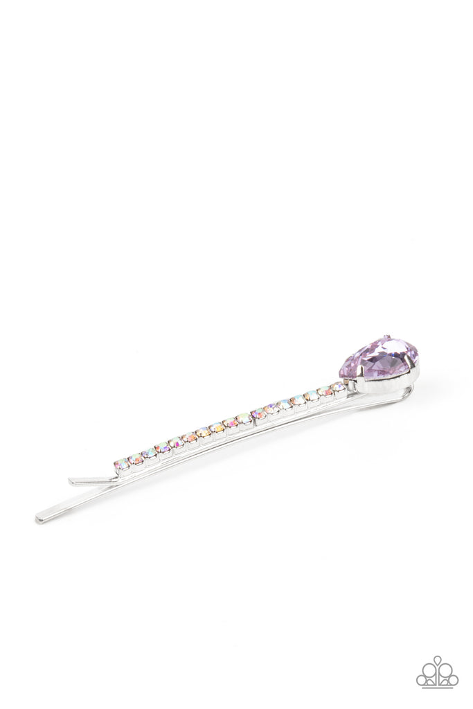 A purple teardrop gem adorns the corner of a bobby pin that is adorned in opalescent rhinestones for a glamorous finish.