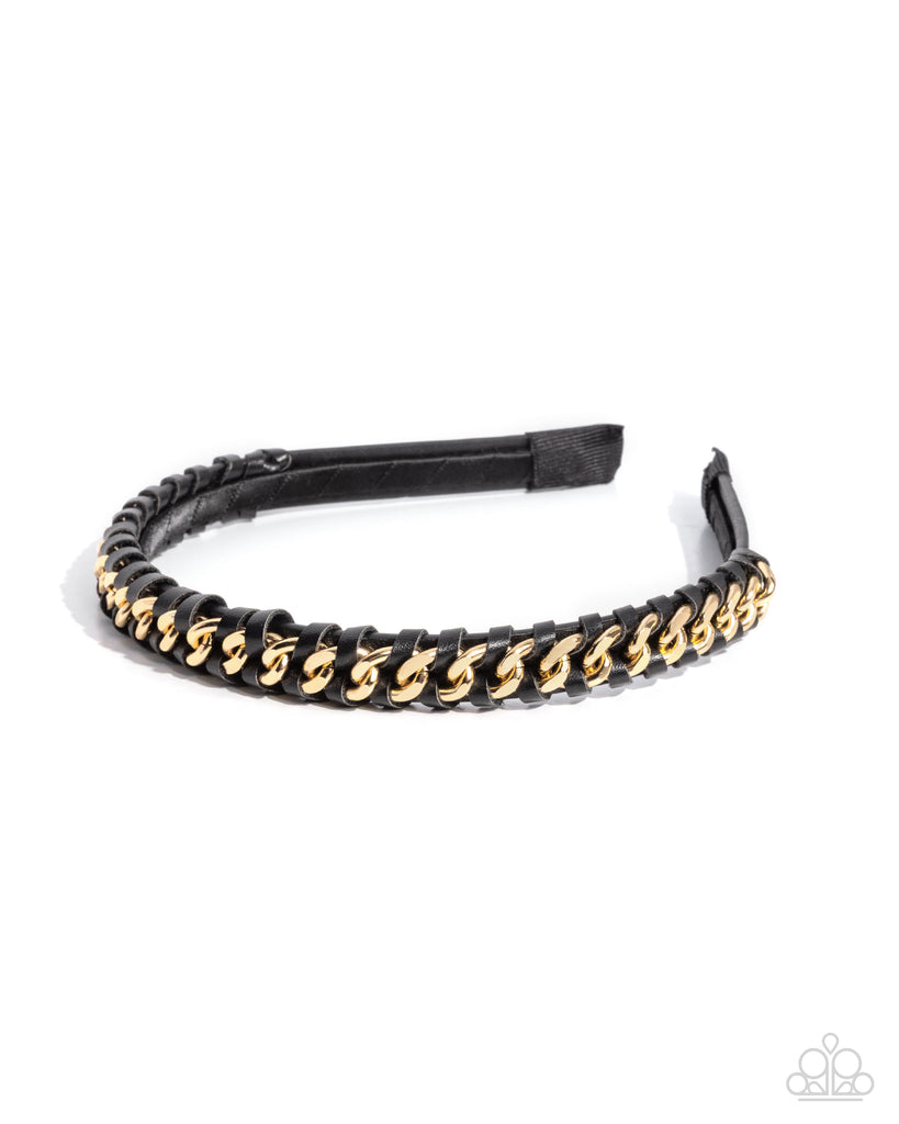 Interwoven through cut strips of high-sheen black leather, a glistening gold curb chain curves atop the head, evoking a powerhouse preppy style.