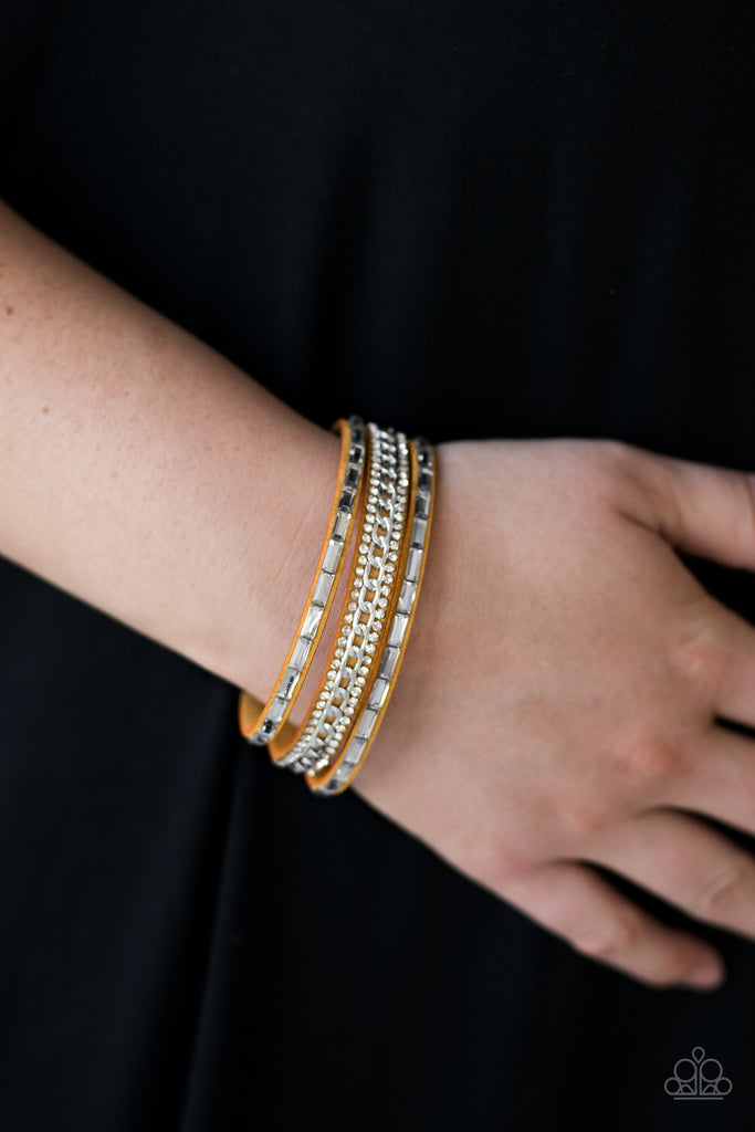 Featuring round and emerald style cuts, glittery rhinestones are sprinkled along strands of rustic yellow suede for a sassy look. A single strand of silver chain is laid down the center for a bold industrial finish. Features an adjustable snap closure.