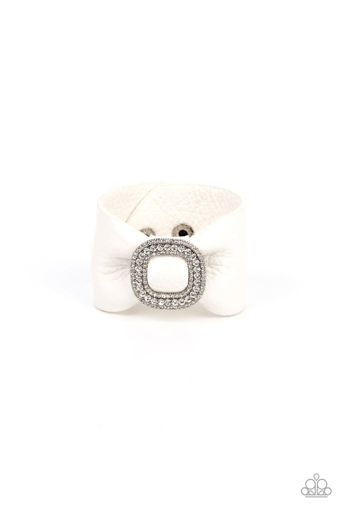 A thick white pleather band delicately knots around the wrist. Stacked with brilliant white rhinestones, a dramatic silver buckle sparkles at the center of the wrist for a dramatic finish. Features an adjustable snap closure.