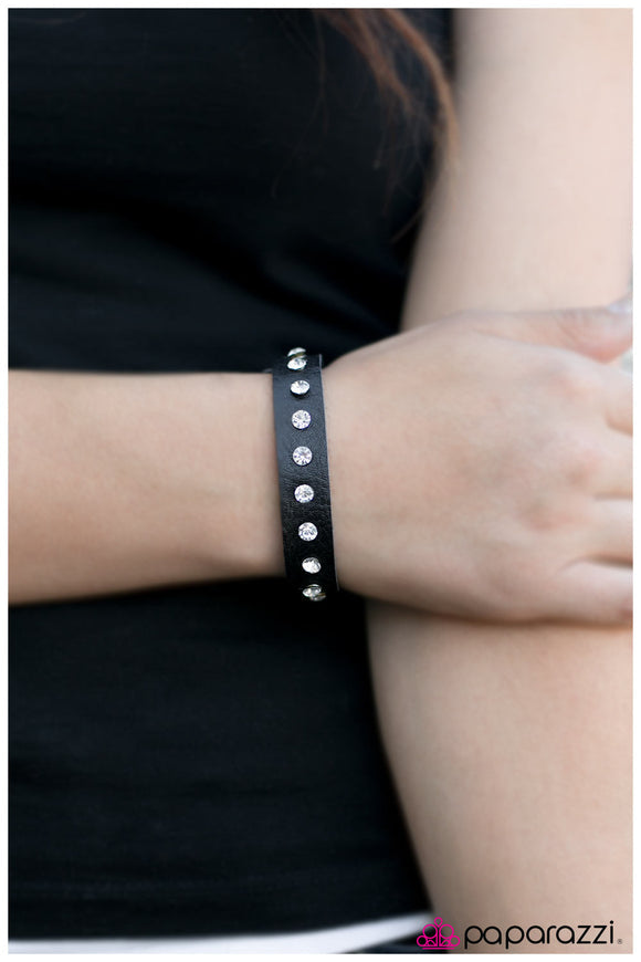 A skinny strip of black leather is infused with a dazzling row of white rhinestones. The spunky band and shimmery rhinestone evoke an urban edge. Features an adjustable snap closure.