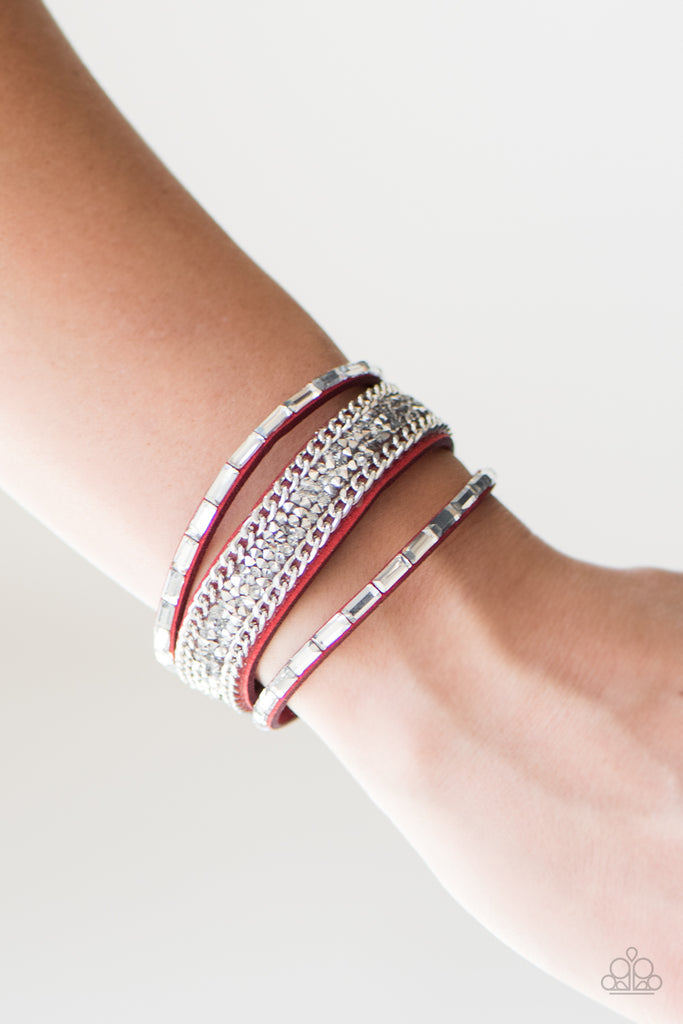 Glassy emerald and prism cut rhinestones are sprinkled along three strands of red suede. Two rows of silver chain flank the centermost strand, adding industrial edge to the sassy palette. Features an adjustable snap closure.