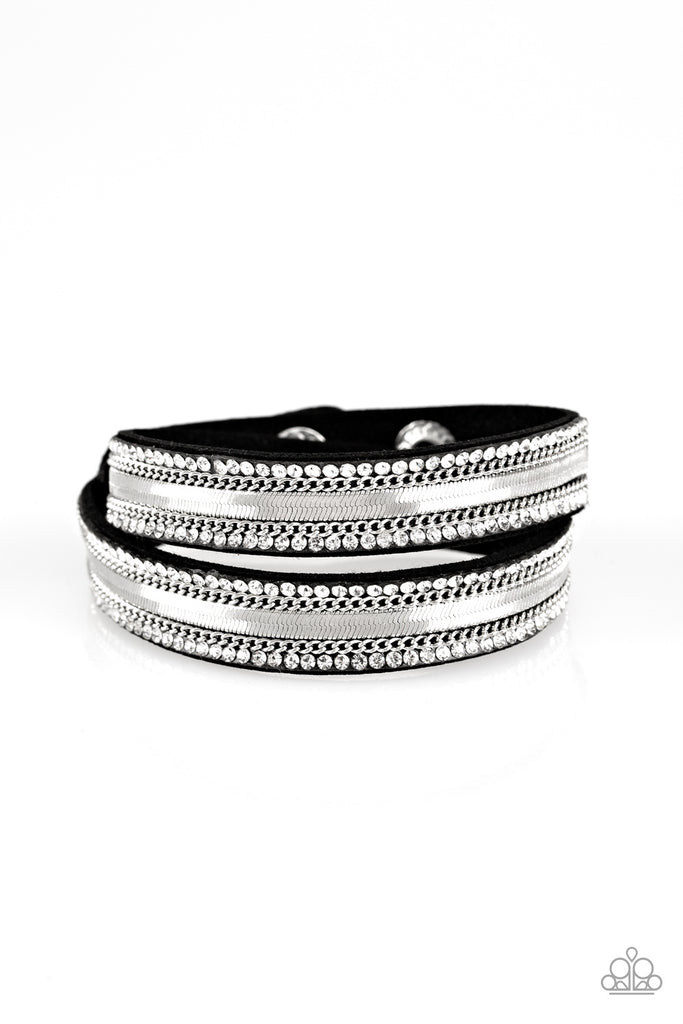 Rows of classic silver chain, flat silver chain, and dainty white rhinestones are encrusted along a black suede band for a sassy look. The elongated band allows for a trendy double wrap design. Features an adjustable snap closure.