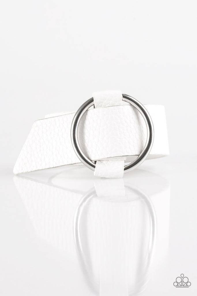 Brushed in a white finish, a strip of textured leather loops through a circular fitting for a simplistic look.