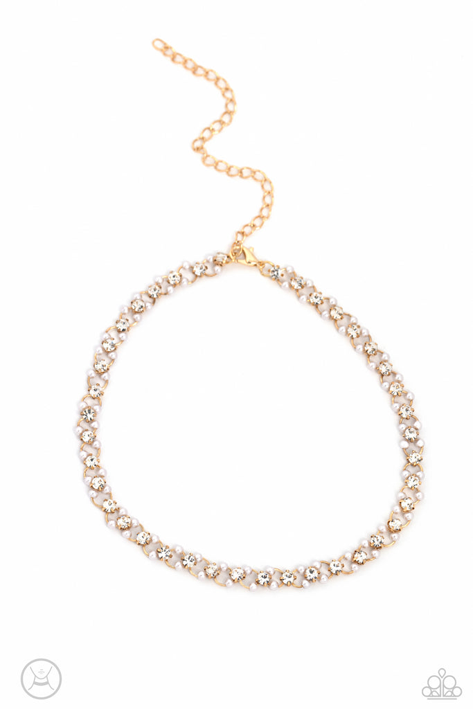 Delicately etched in subtle shimmer, a classic gold chain is infused with dainty white pearls and white-pronged gems for a dainty display of class that drapes across the collar. Features an adjustable clasp closure.