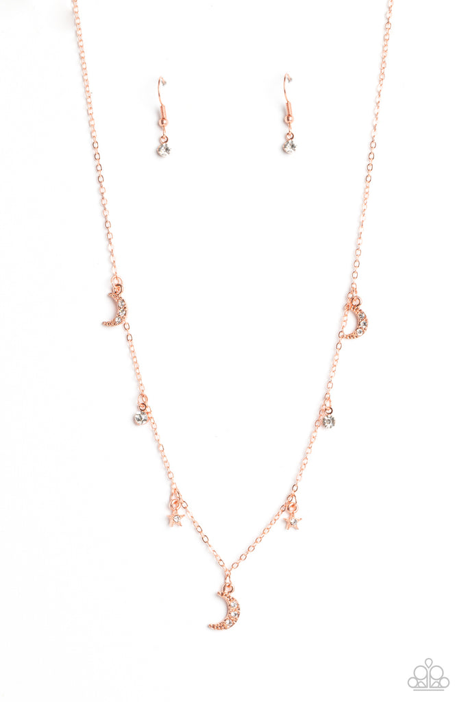 Dotted with dainty white rhinestones, a cosmic collection of shiny copper moon and star charms swings from a dainty shiny copper chain below the collar. Solitaire white rhinestones sparkle in between the charms, adding additional sparkle to the piece. Features an adjustable clasp closure.