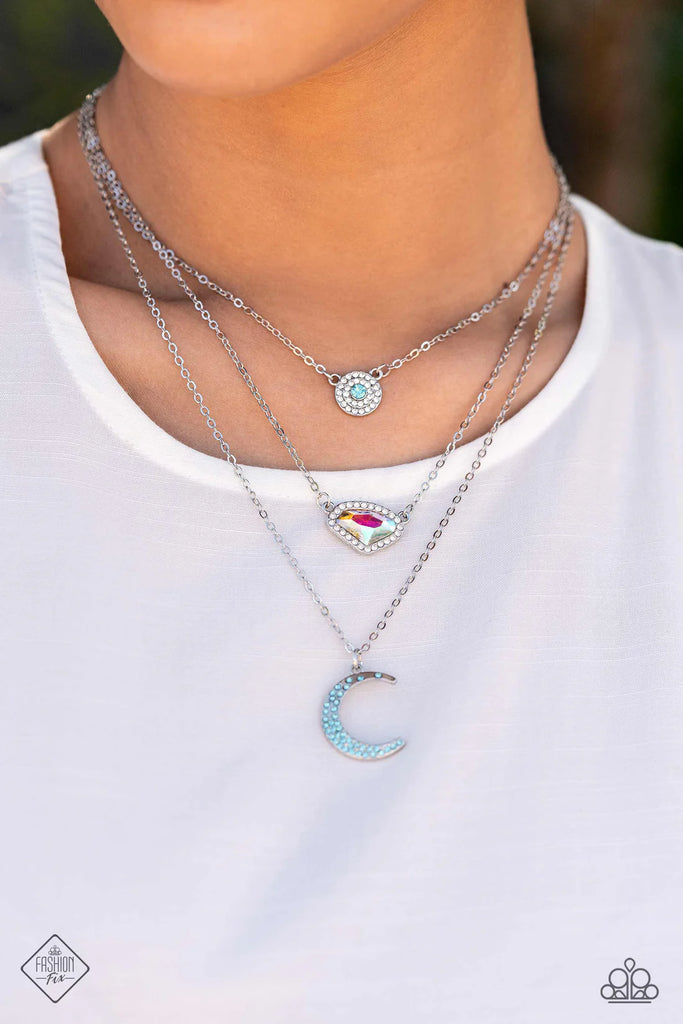 Three shimmery silver chains, infused with three stellar pendants, layer across the chest in a celestial display. A dainty, white rhinestone-encrusted, silver pendant with an aquamarine center swings from the uppermost chain, followed by an asymmetrical, jagged, blue iridescent gem encased in a border of dainty white rhinestones, and a silver crescent moon charm with dainty aquamarine rhinestones, creating a starry shimmer. Due to its prismatic palette, color may vary.